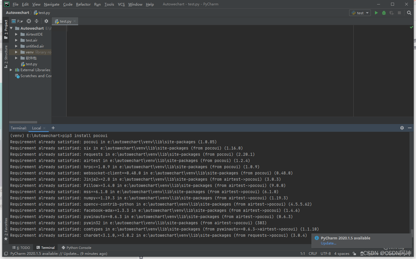 新建python虚拟环境后随意创建个py文件,点击下方Terminal终端输入:pip3 install pocoui
