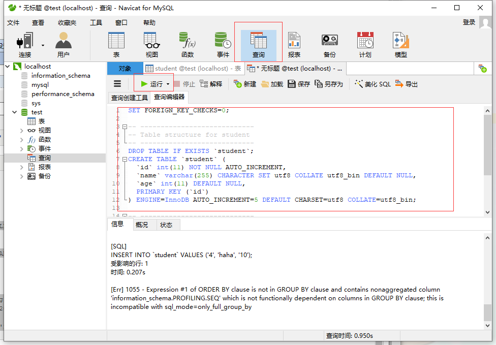 SET FOREIGN_KEY_CHECKS=0; -- ---------------------------- -- Table structure for student -- ---------------------------- DROP TABLE IF EXISTS `student`; CREATE TABLE `student` ( `id` int(11) NOT NULL AUTO_INCREMENT, `name` varchar(255) CHARACTER SET utf8 COLLATE utf8_bin DEFAULT NULL, `age` int(11) DEFAULT NULL, PRIMARY KEY (`id`) ) ENGINE=InnoDB AUTO_INCREMENT=5 DEFAULT CHARSET=utf8 COLLATE=utf8_bin; -- ---------------------------- -- Records of student -- ---------------------------- INSERT INTO `student` VALUES ('1', 'xiaoming', '43'); INSERT INTO `student` VALUES ('2', 'tom', '20'); INSERT INTO `student` VALUES ('3', 'lilei', '90'); INSERT INTO `student` VALUES ('4', 'haha', '10');