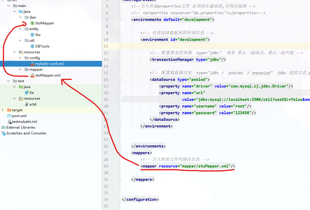<?xml version="1.0" encoding="UTF-8"?> <!DOCTYPE configuration PUBLIC "-//mybatis.org//DTD Config 3.0//EN" "http://mybatis.org/dtd/mybatis-3-config.dtd"> <configuration> <!--引入外部properties文件 必须放在最前面,否则会报错 --> <!-- <properties resource="db.properties"></properties>--> <environments default="development"> <!-- 代表连接数据库的环境信息 --> <environment id="development"> <!-- 配置事务管理器 type="jdbc" 事务 要么一起成功,要么一起失败 --> <transactionManager type="jdbc"/> <!-- 配置数据源信息 type="jdbc / pooled / unpooled" jdbc 连接方式 pooled 连接池技术--> <dataSource type="pooled"> <property name="driver" value="com.mysql.cj.jdbc.Driver"/> <property name="url" value="jdbc:mysql://localhost:3306/util?useSSL=false&useUnicode=true&characterEncoding=UTF8&serverTimezone=GMT"/> <property name="username" value="root"/> <property name="password" value="123456"/> </dataSource> </environment> </environments> <mappers> <!-- 引入映射文件的路径信息 --> <mapper resource="mapper/stuMapper.xml"/> </mappers> </configuration>