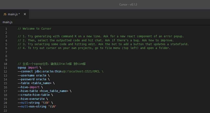 ctrl+K,我们让他执行生成一个生成一个sqoop任务,确保从Oracle库 到hive库,响应速度很快,准确率也很高,基本做一下配置就能使用了。这比去百度快了不止多少倍。
