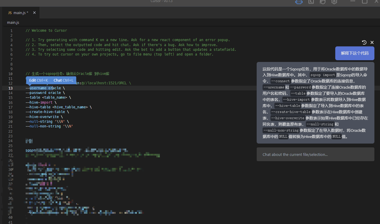 最近,有一个编辑器火上了天,他就是Cursor,免费集成了openAI的gpt-4,不需要魔法上网,重点是免费。直接使用Ctrl+K , 输入指令就能使用,ctrl+L ,在选中代码以后可以直接提问,会有对应的解释。