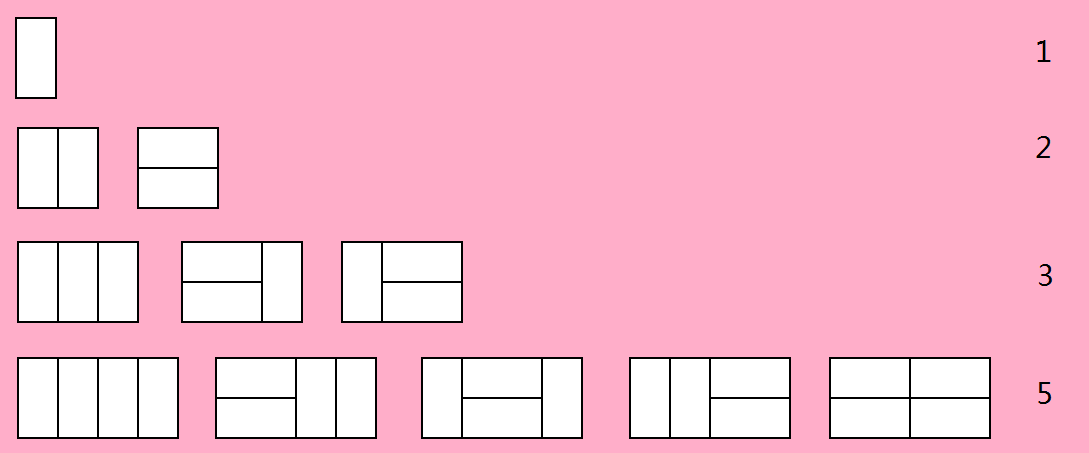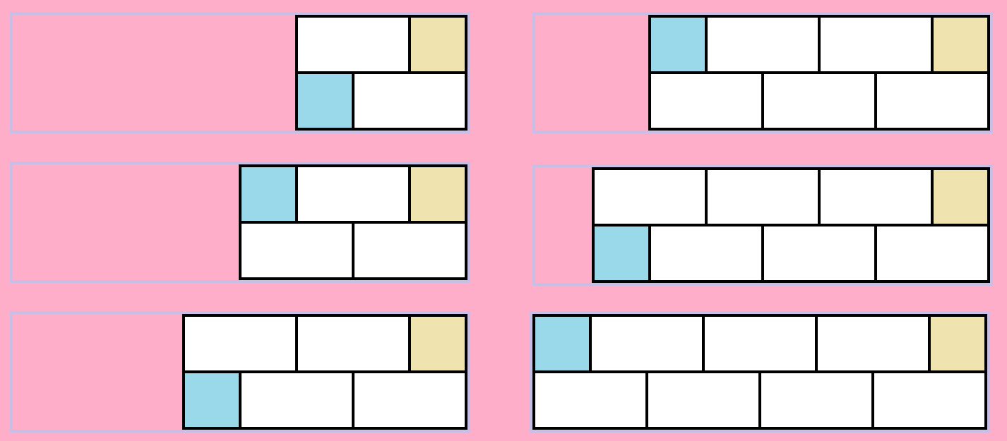 另一个 \(1*1\) 方块(称作小蓝)可以放在下方或上方,我们发现对于每一个位置,小蓝右边区域的放置方案是固定的,小蓝左边区域只需要使用 \(1*2\) 的方块进行填充。