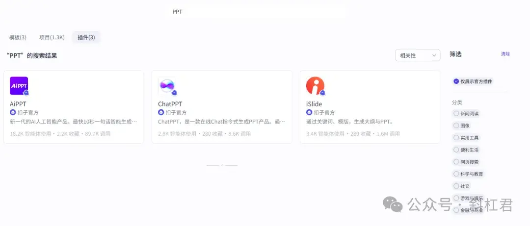 扣子平台提供了几款PPT插件供我们使用,我们来看一下一共有哪几款。