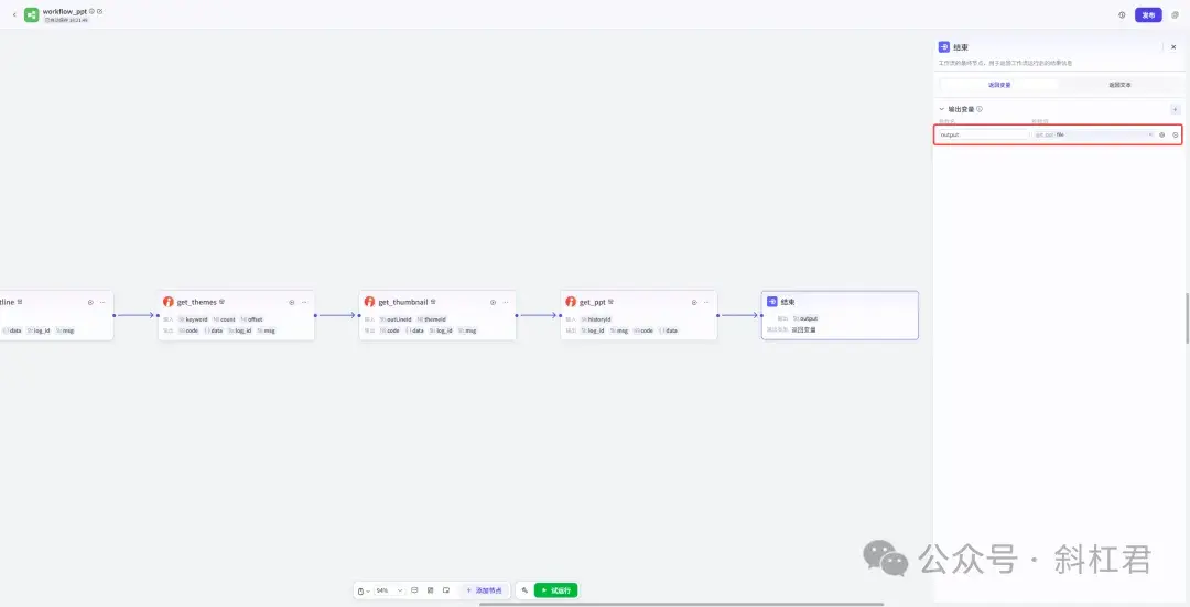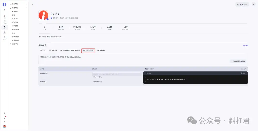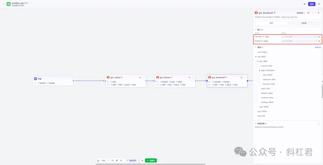 这里我们使用「get_thumbnail」工具,这个工具会返回执行PPT任务的ID,在后面的节点中, 我们会用这个ID去获取PPT的链接。