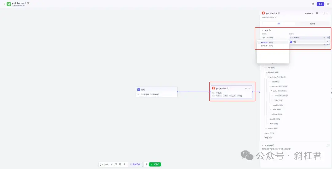 当然,根据每个人需求的不同,这里工作流里还有很多细节的问题需要完善,例如生成的大纲不符合我们的需求如何做,我们是不是还可以引入大模型节点,来为我们生成大纲等。