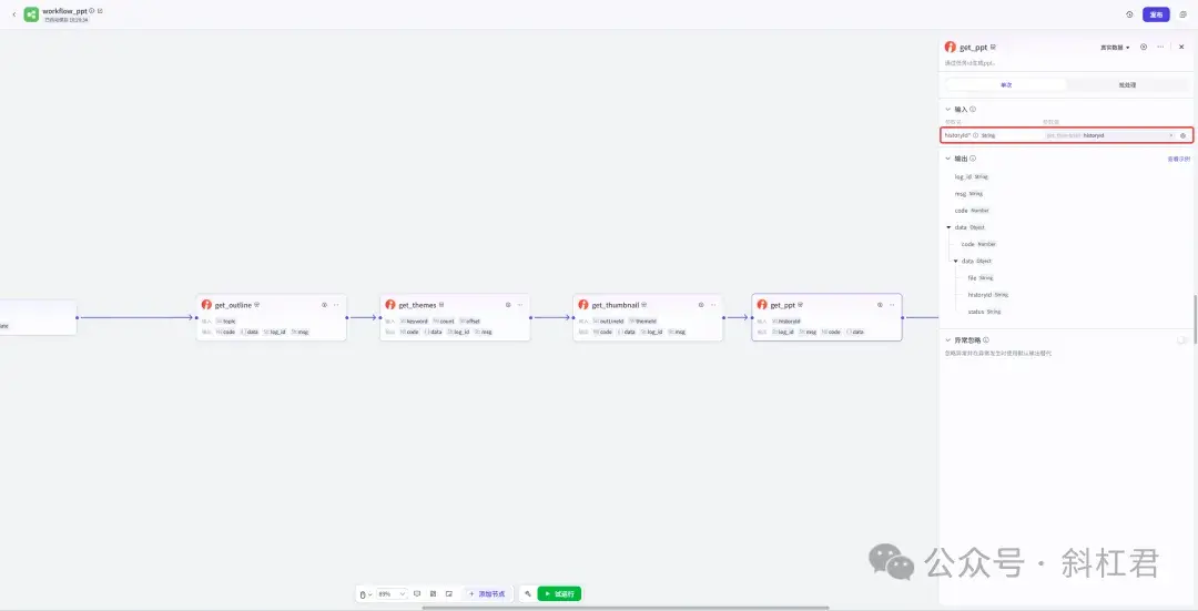 接下来,我们使用前面两个节点生成的「大纲ID」和「模板ID」来生成一个PPT任务。