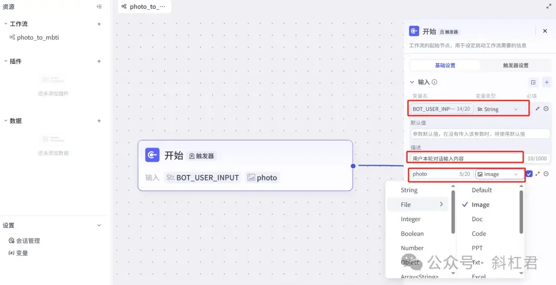 在开始节点这里,需要我们配置好输入的参数,变量1定义为BOT_USER_INPUT,变量类型为:string,描述内容为非必填项(该变量为系统默认的,可以删除);变量2定义为photo,变量类型为image