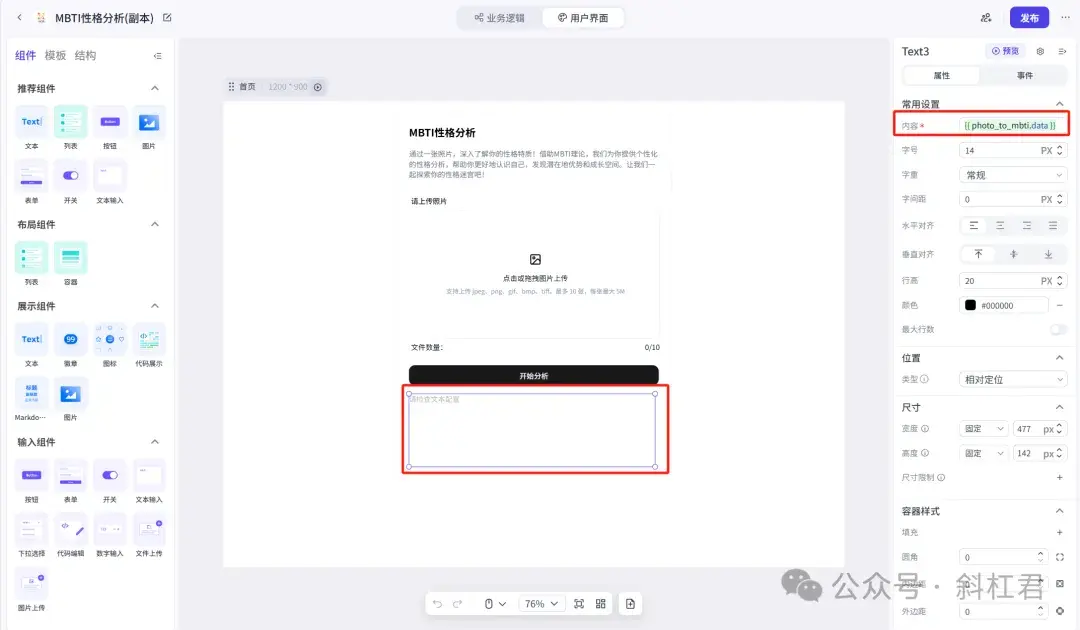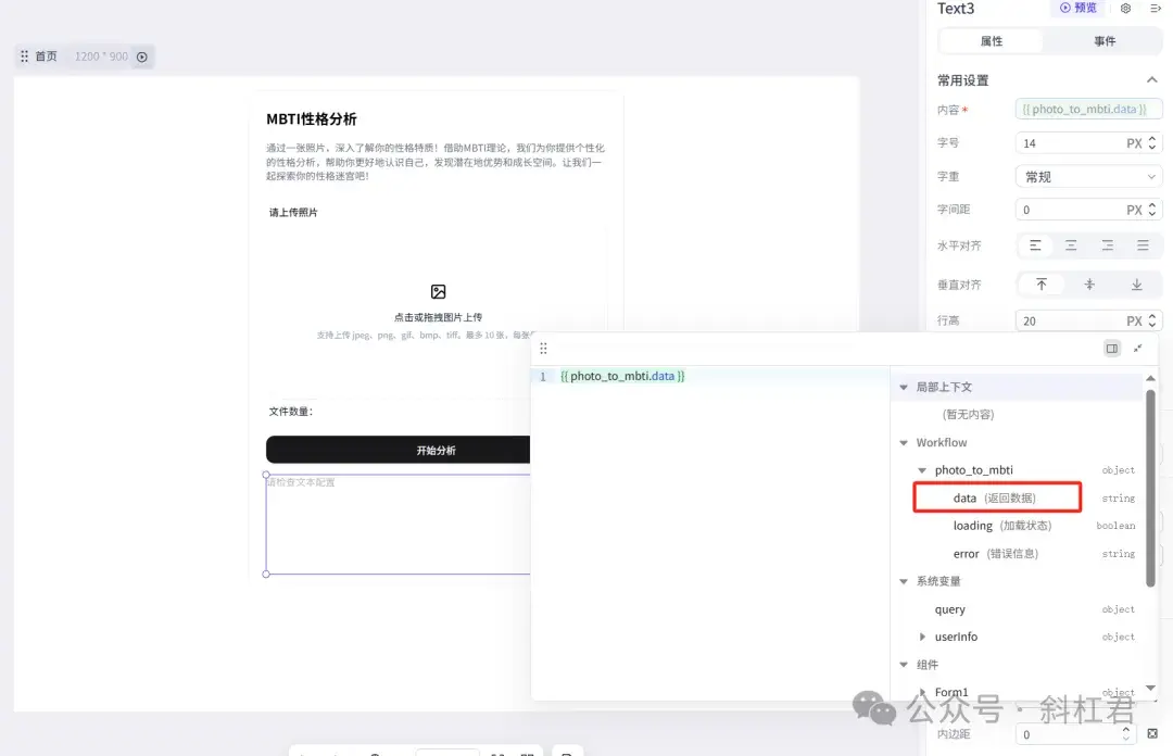 最后加入文本组件,用来显示用户输入的文字,记得在配置栏选中工作流返回的数据