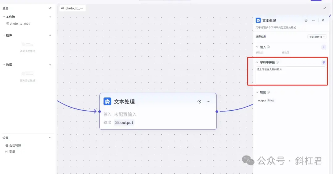 在意图试别后,和大模型节点并列添加一个文本处理的组件,组件输入内容为:请上传包含人物的照片