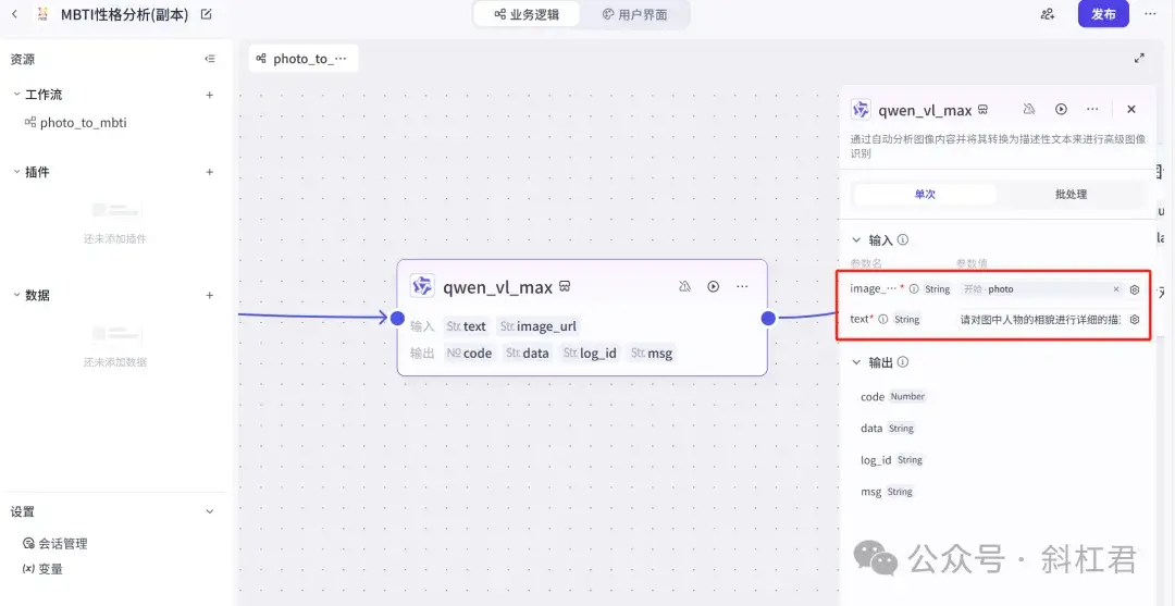 插件的输入参数配置:image部分选择开始节点中输出的photo;text部分为【请对图中人物的相貌进行详细的描述】