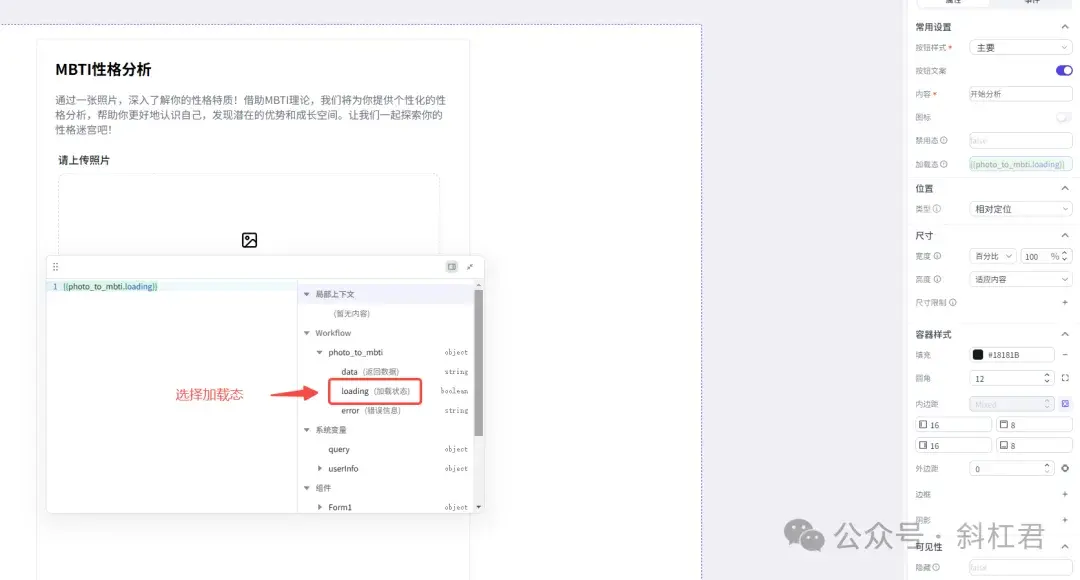 这里说明一下,工作流里有三个主要变量:一个是data,一个是loading,一个是error。这三个变量分别代表的意思是:data:工作流返回的值;loading:表示工作流是否在运行;error:如果工作流出错会返回错误信息。那这里我们就选择loading作为「加载态 」的状态。