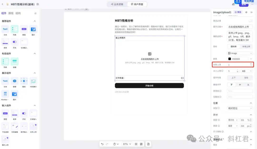 注:图片的总数上限调整为1,即每次允许用户上传一张照片