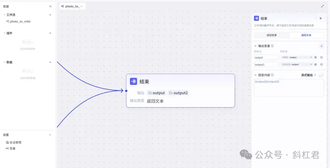 将大模型节点和文本组件节点后连接到结束节点上,输出变量1参数名定义为output,参数值选择大模型节点的output;输出变量2参数定义为output2,参数值文本处理的output;回答内容为{output}{output2}