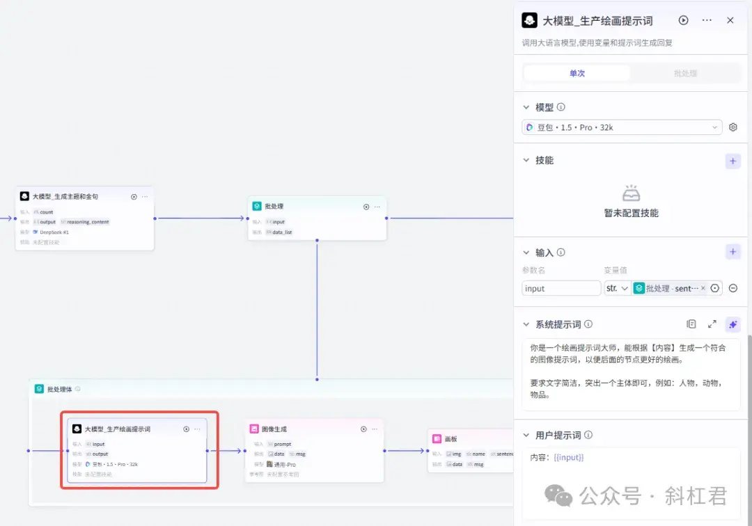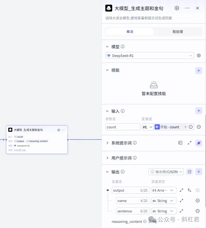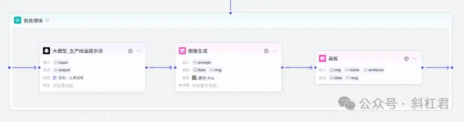 批处理节点用来批量处理大模型生成的主题和金句。