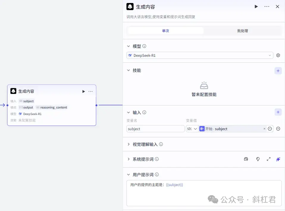 之前有很多同学提问,为什么批处理节点引用不到大模型节点输出的内容,就因为批处理节点的输入变量需要是一个数组,如果不是数组的话,是引用不到的。