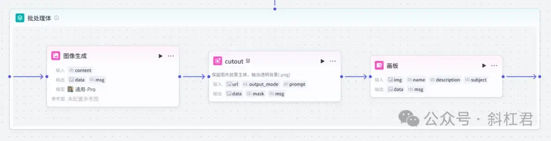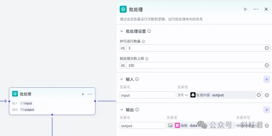 批处理节点的作用是引用大模型节点输出的内容,批量生成图片。