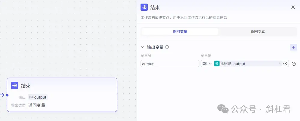 结束节点用来把「批处理节点」生成的图文内容进行输出,输出的内容是一个图片的数组。