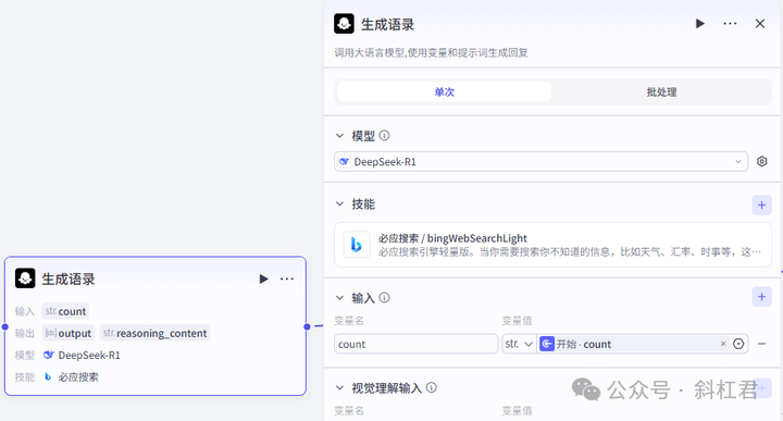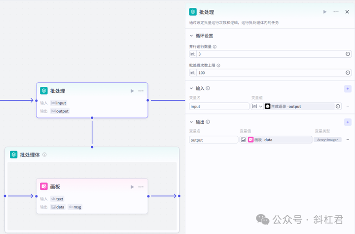 批处理节点的作用是引用大模型节点输出的语录内容,批量生成图文。