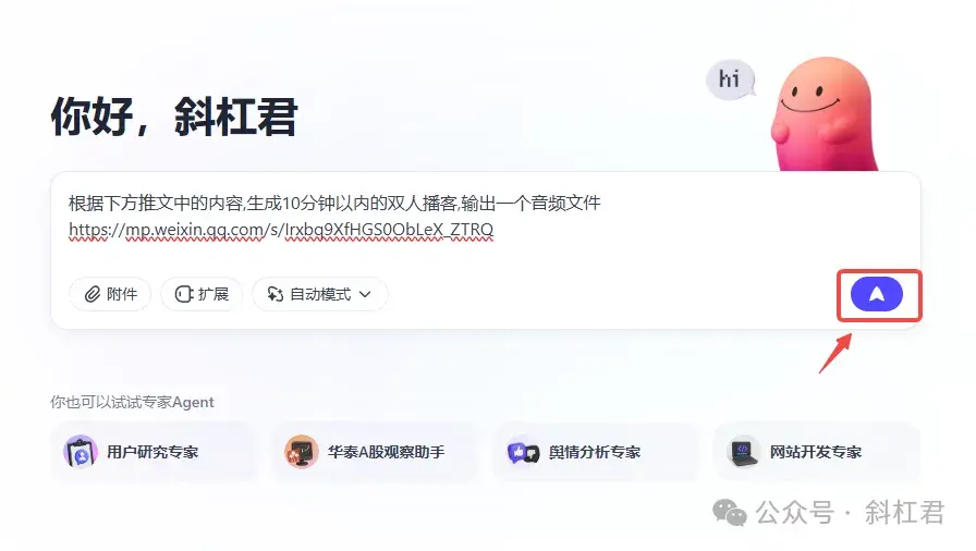 接下来,话不多说,斜杠君用最简单的方式教给大家,如何通过文章链接一键生成播客。 大家可以关注收藏,以免之后找不到,而且也不会错过我后面的教程。