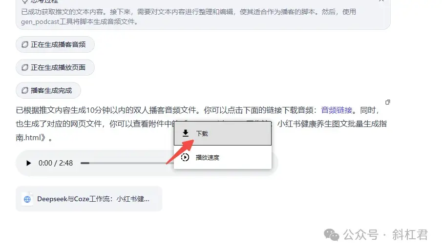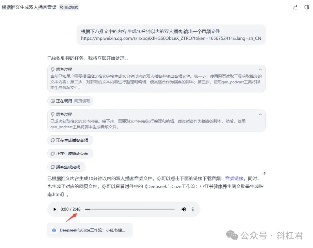怎么样,整个过程是不是超级简单,之前斜杠君为了生成播客内容,还自己搭建了一套工作流,现在就变得非常容易了。