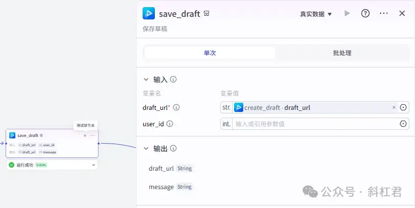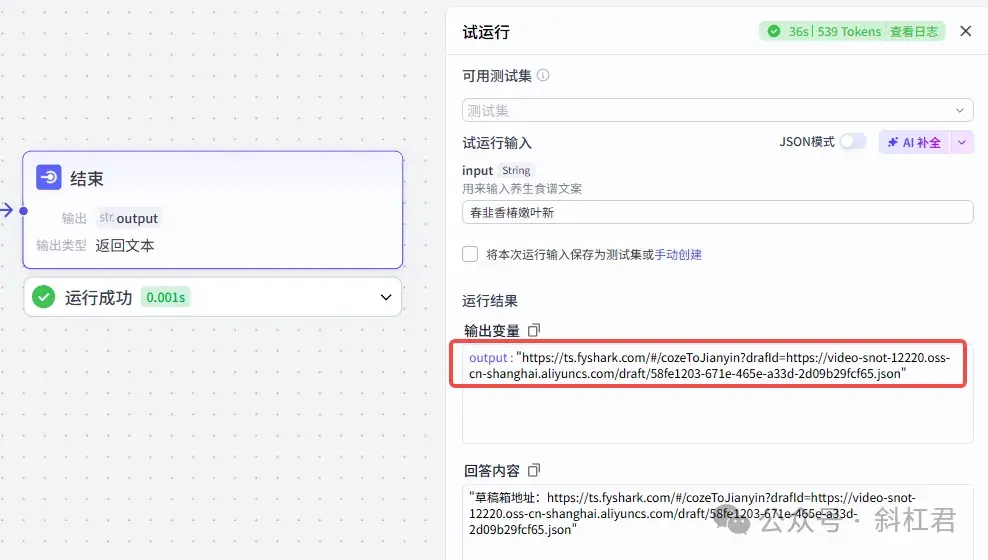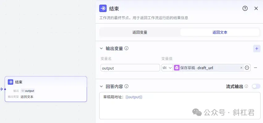 结束节点用来输出草稿箱地址。
