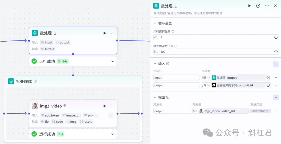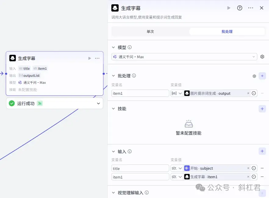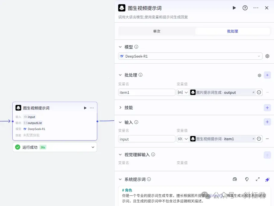 这里注意,这一步很重要。我们引用一个大模型的节点,用来生成「图生视频」需要的提示词。这里我们用的是大模型的批处理,这样生成的「图生视频提示词」和「图片提示词」就一一对应上了。