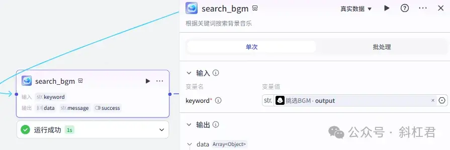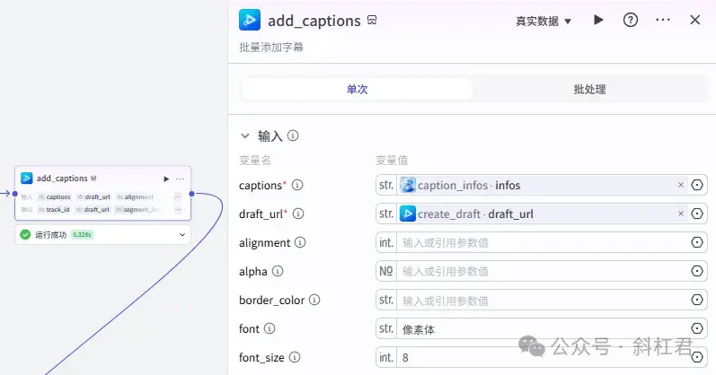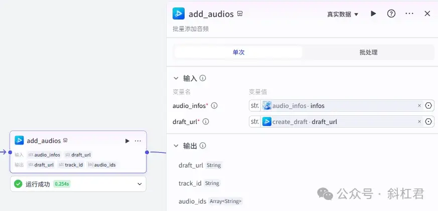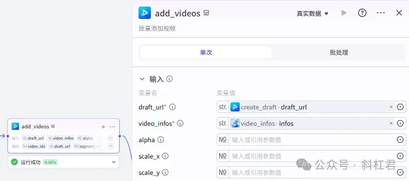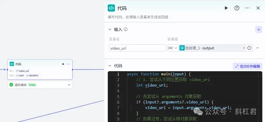 这里的代码节点在整个工作流很重要,相对也稍显复杂,主要作用是用来组合后面「剪映小助手」插件节点中需要的数据内容。