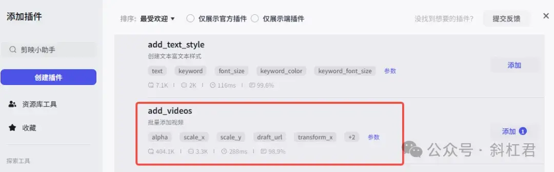 接下来把前面生成的视频加入到草稿。插件商店搜索「剪映小助手」,添加「add_videos」插件。