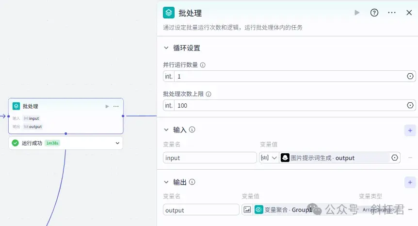 接下来,这里我们要使用批处理节点,根据前面生成的分镜图像提示词,批量生成视频中的每一幅图片。