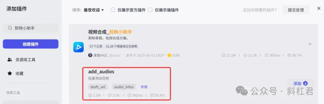 我们在插件商店找到一个搜索背景音乐的插件,然后把找到的音乐导入到视频中,我们要用到添加音频的节点。插件商店搜索「剪映小助手」,添加「add_audios」插件。