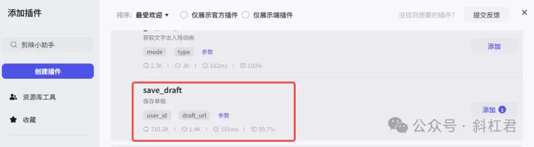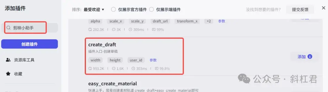 如果要生成视频文件,首先要通过剪映小助手创建草稿,相当于初始化了一个剪映的草稿文件。插件商店搜索「剪映小助手」,添加「create_draft」插件。