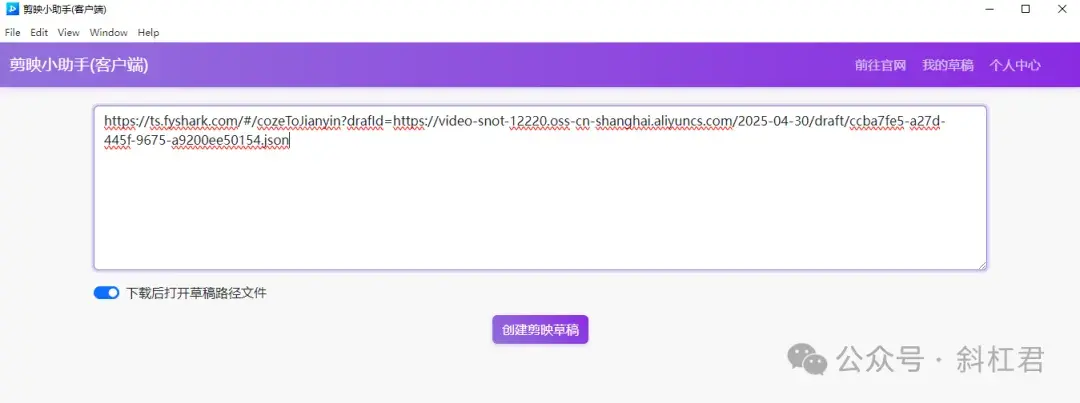 有了这个地址以后,我们要下载一个剪映小助手(客户端),我们把这个地址粘贴到客户端中: