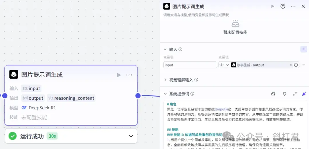 这里我们引入一个大模型节点,为生成的故事,制作分镜图片的提示词。