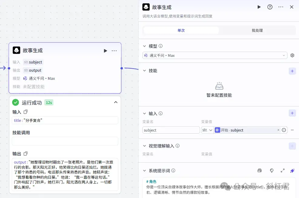 这里我们使用一个大模型节点,作用是围绕用户输入的主题,来生成一个温暖、治愈、成长或轻幽默的故事。生成故事的字数,大家根据自己的需要进行一些限制。