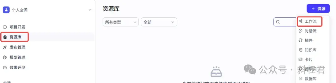 1. 首先新建一个工作流,点击「资源库」,然后选择工作流。