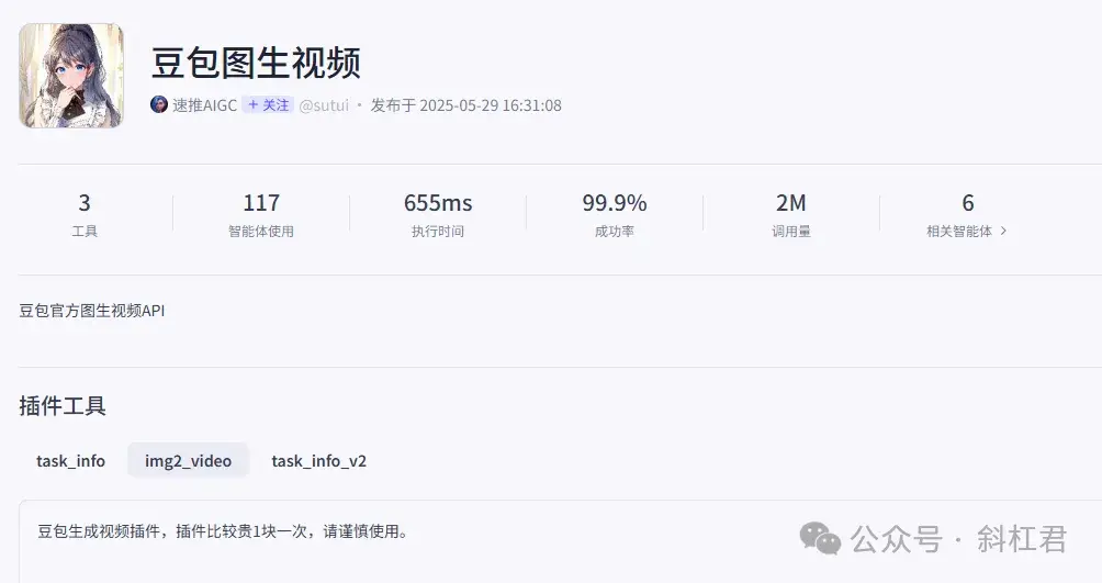 插件使用的是「豆包图生视频」插件。大家在插件商店搜索「豆包图生视频」就可以找到了。用这个插件的好处是生成的速度比较快,缺点是价格略高,如果不追求响应的速度,建议大家可以用「即梦图生视频」插件代替。