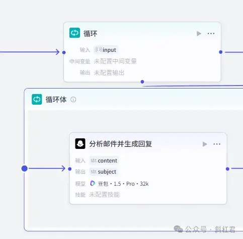 循环读取每一封邮件的内容,这里我们用一个循环节点进行读取。然后对每一封邮件的内容进行分析,以便理解邮件的内容后回复用户。这里我们使用一个大模型节点,来进行邮件的分析,并生成合理的的回复。