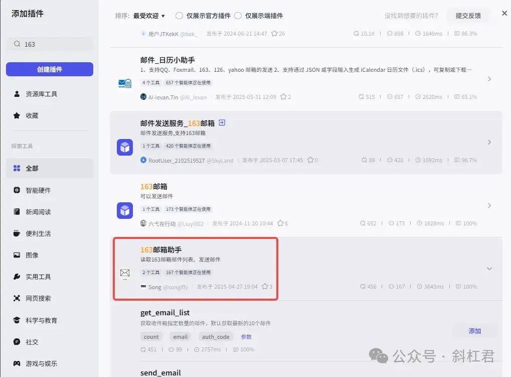 我们可以在插件商店搜索“邮件”会搜索到很多关于邮件的插件,我们以163的邮箱为大家演示。大家可以根据自己的邮箱选择对应的插件。