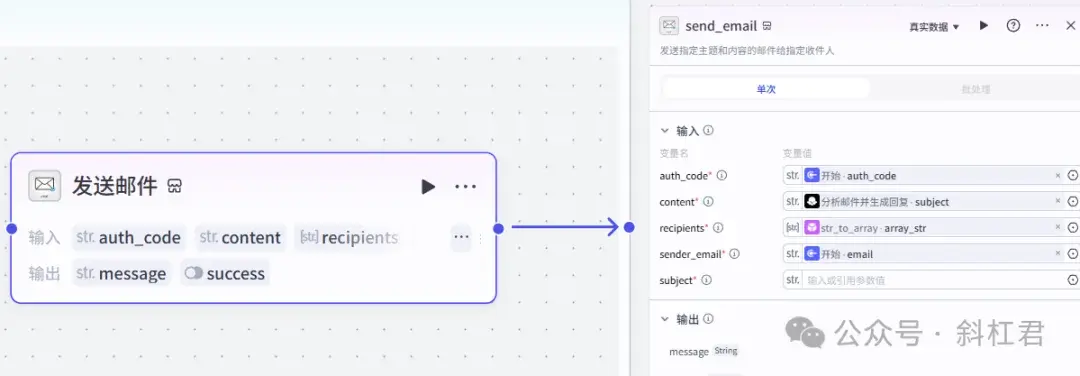这里,我们同样需要一个“发送邮件”的插件。和第一步类似,选择与你邮箱匹配的发送插件即可。然后,使用大模型生成的内容,我们就可以发邮件回复用户了。
