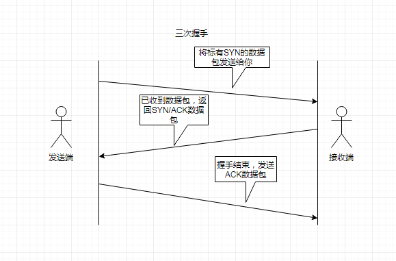 发送端首先发送一个带有SYN标志的发送包。接收端收到后,会返回一个带有SYN/ACK标志的数据包,以确认数据包已经送达。最后,发送一个带有ACK的数据包代表握手结束。