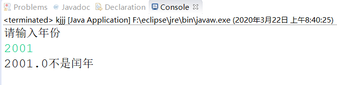 import java.util.*; public class kjjj { public static void main(String[] args) { // TODO Auto-generated method stub Scanner input=new Scanner(System.in); System.out.println("请输入年份"); double year=input.nextDouble(); if(year%4==0 && year%100!=0){; System.out.println(year+"是闰年"); }else if(year%400==0){; System.out.println(year+"是闰年"); }else{ System.out.println(year+"不是闰年"); } } }