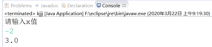 import java.util.*; public class kjjj { public static void main(String[] args) { // TODO Auto-generated method stub Scanner input=new Scanner(System.in); System.out.println("请输入x值"); double x=input.nextDouble(); double y; if(x>0){ System.out.println(x+3); }else if(x==0){ System.out.println(0); }else if(x<0){ System.out.println(x*x-1); } } }