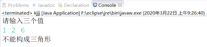import java.util.*; public class kjjj { public static void main(String[] args) { // TODO Auto-generated method stub Scanner input=new Scanner(System.in); System.out.println("请输入三个值"); double x=input.nextDouble(); double y=input.nextDouble(); double z=input.nextDouble(); if(x+y>z && x+z>y && y+z>x){ System.out.println("能构成三角形"); }else{ System.out.println("不能构成三角形"); } } }