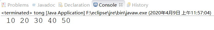 public class tong { public static void main(String[] args) { int[] arr = new int[] { 10, 20, 30, 40, 50 }; for (int i = 0; i < arr.length; i++) { System.out.print(" "+arr[i]); } } }