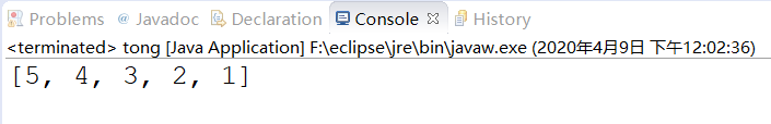import java.util.Arrays; public class tong { public static void main(String[] args) { int[] arr = { 1, 2, 3, 4, 5 }; int t; for (int i = 0; i < arr.length / 2; i++) { t = arr[i]; arr[i] = arr[arr.length - i - 1]; arr[arr.length - i - 1] = t; } System.out.println(Arrays.toString(arr)); } }