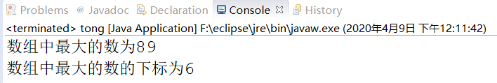 public class tong { public static void main(String[] args) { int[] arr = new int[] { 18, 25, 7, 36, 13, 2, 89, 63 }; int max = arr[0]; for (int i = 0; i < arr.length; i++) { if (max < arr[i]) { max = arr[i]; } } System.out.println("数组中最大的数为" + max); int count = 0; for (int i = 0; i < arr.length; i++) { if (max == arr[i]) { System.out.println("数组中最大的数的下标为" + count); } count++; } } }