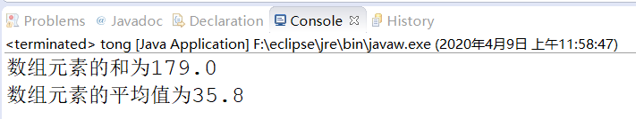public class tong { public static void main(String[] args) { int[] arr = new int[] { 23, 45, 22, 33, 56 }; double sum = 0; double avg; for (int i = 0; i < arr.length; i++) { sum +=arr[i]; continue; } System.out.println("数组元素的和为"+sum); avg = sum / 5; System.out.println("数组元素的平均值为"+avg); } }