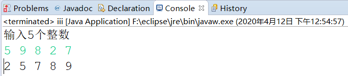 1 public static void main(String[] args) { 2 int[] arr = new int[5]; 3 System.out.println("输入5个整数"); 4 Scanner input = new Scanner(System.in); 5 for (int i = 0; i < arr.length; i++) { 6 arr[i] = input.nextInt(); 7 } 8 for (int i = 0; i < arr.length - 1; i++) { 9 for (int j = 0; j < arr.length - 1 - i; j++) { 10 if (arr[j] > arr[j + 1]) { 11 int temp = arr[j]; 12 arr[j] = arr[j + 1]; 13 arr[j + 1] = temp; 14 } 15 } 16 } 17 for (int i = 0; i < arr.length; i++) { 18 System.out.print(arr[i] + " "); 19 } 20 }