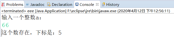 1 public static void main(String[] args) { 2 int[] arr = { 34, 22, 35, 67, 45, 66, 12, 33 }; 3 System.out.println("输入一个整数a:"); 4 Scanner input = new Scanner(System.in); 5 while (true) { 6 int a = input.nextInt(); 7 for (int i = 0; i < arr.length; i++) 8 if (a == arr[i]) { 9 System.out.println("这个数存在,下标是:" + i); 10 return; 11 } 12 System.out.println("no found"); 13 } 14 }