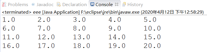 1 public static void main(String[] args) { 2 double arr[][] = { { 1, 2, 3, 4, 5 }, { 6, 7, 8, 9, 10 }, { 11, 12, 13, 14, 15 }, { 16, 17, 18, 19, 20 } }; 3 for (int i = 0; i < arr.length; i++) { 4 for (int j = 0; j < arr[i].length; j++) { 5 System.out.print(arr[i][j] + "\t"); 6 } 7 System.out.println(); 8 } 9 }